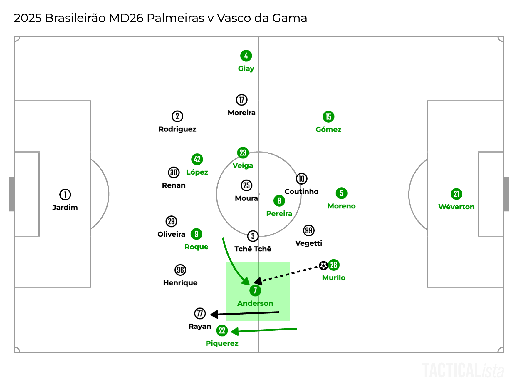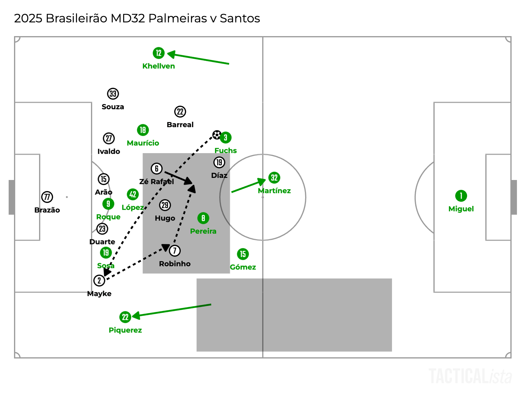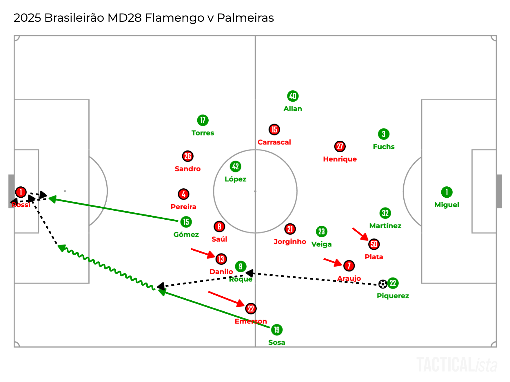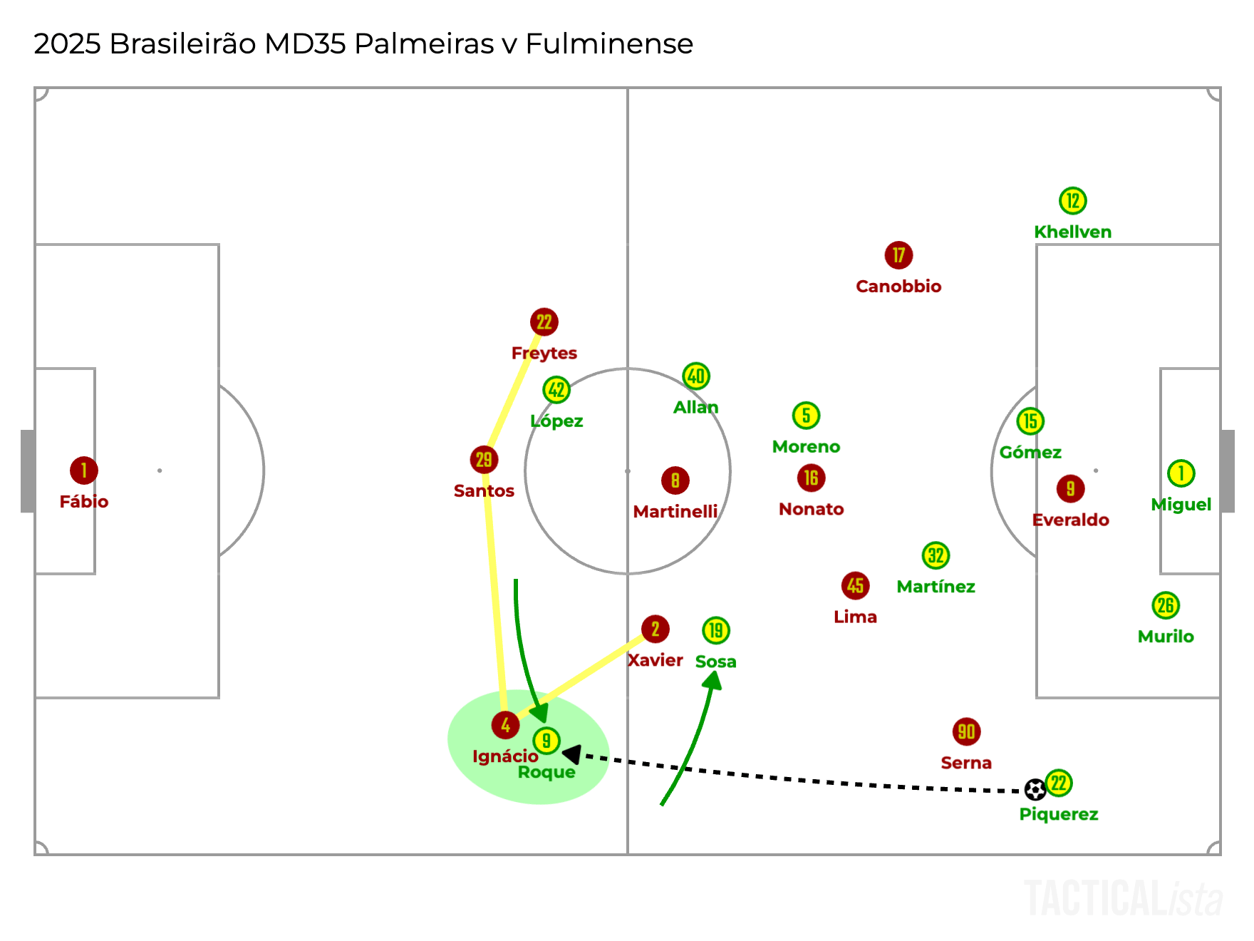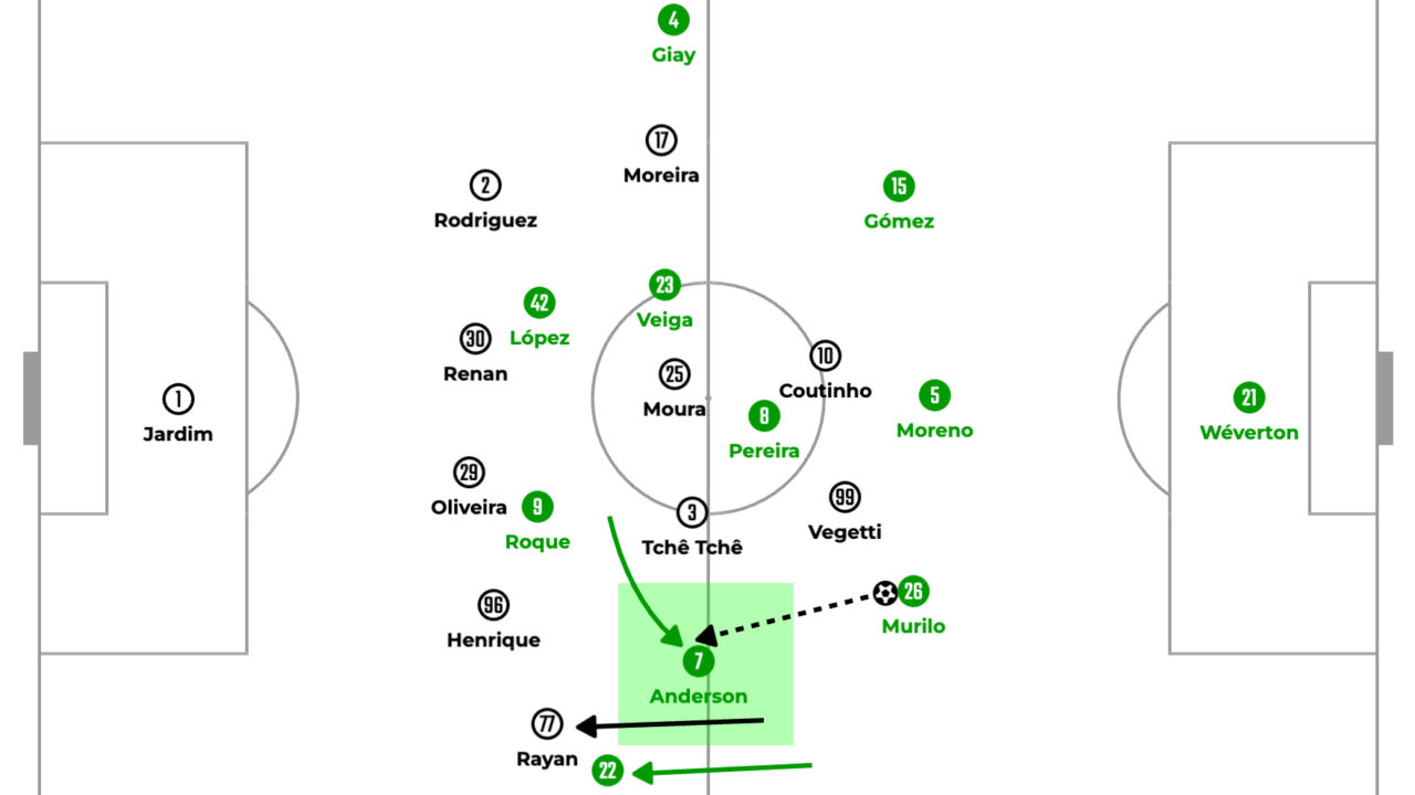 Thanks to the player staying wide and high, the gap between the wide player and centre back is often open. And most Brazilian teams get the winger to drop back if the opposition fullback moves higher, so like the illustration above, when Piquerez went higher, there was space for Felipe Anderson to exploit by drifting outside.