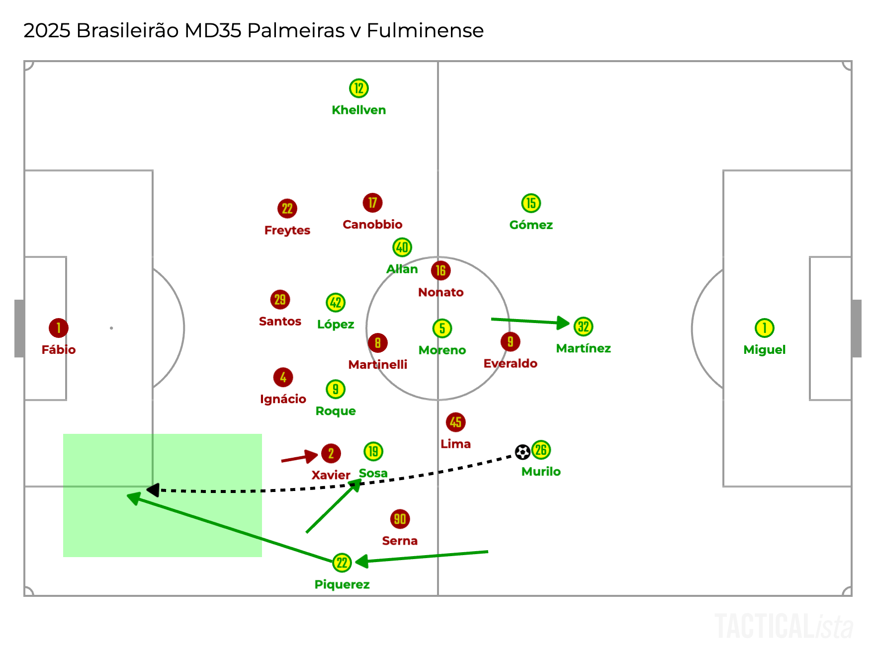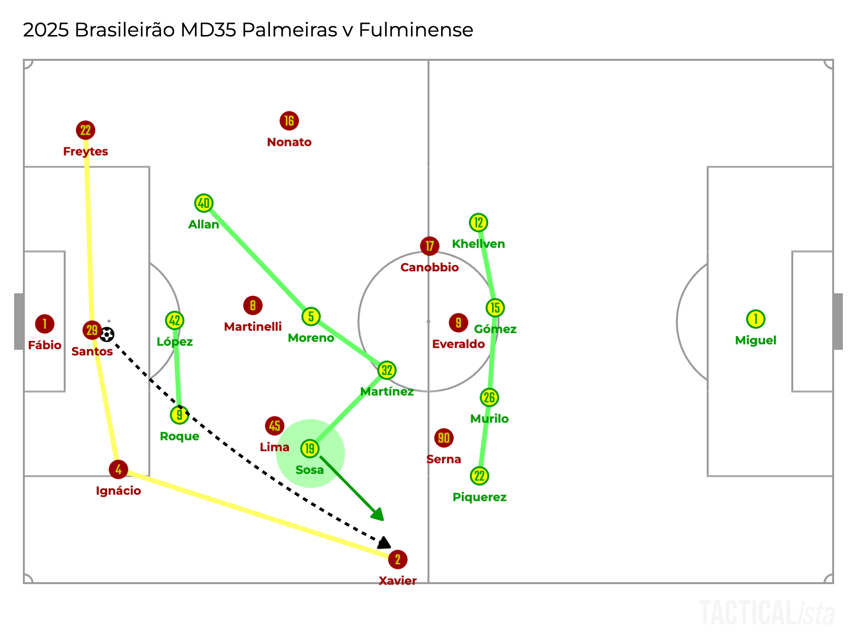 Here, the opposition winger didn’t track Piquerez’s movement, but the opposition fullback stuck to Sosa coming inside. Therefore, Murilo Cerqueira simply played in behind and Piquerez exploited the space there.