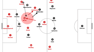 Again, Salah was in possession and this time Frimpong made an overlapping run. This also made it difficult for the opponents to defend as they faced two possible options. Salah decided to go inside and played a one-two with Gravenberch to penetrate into the box to score.
