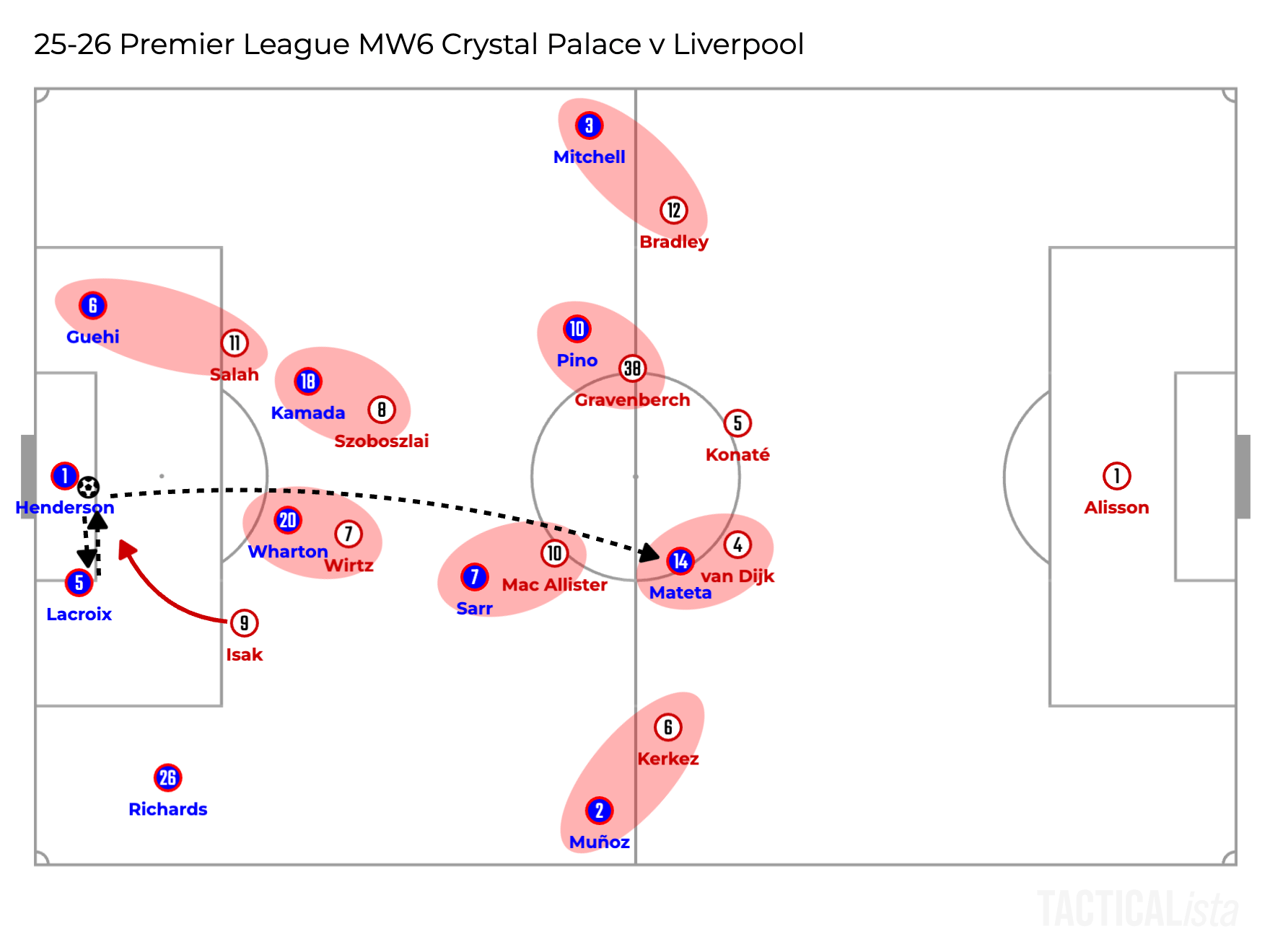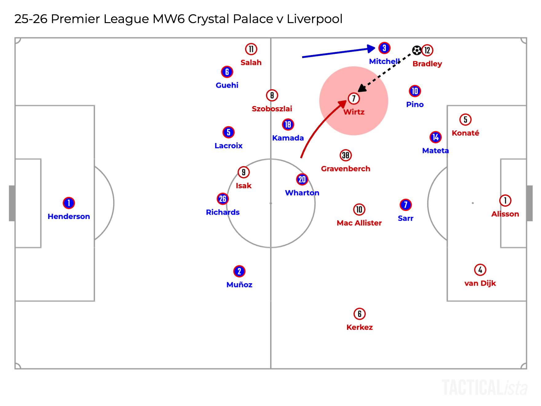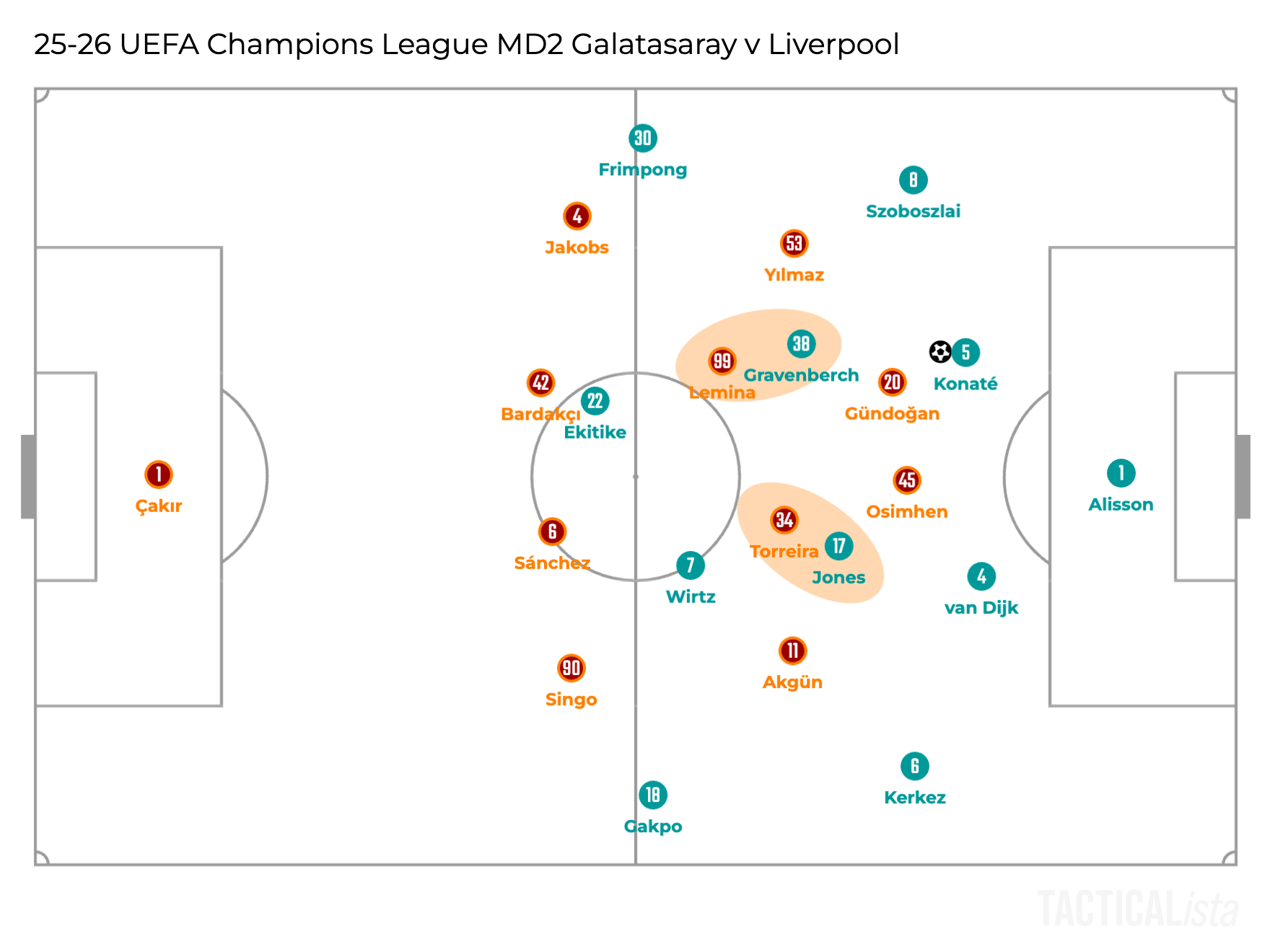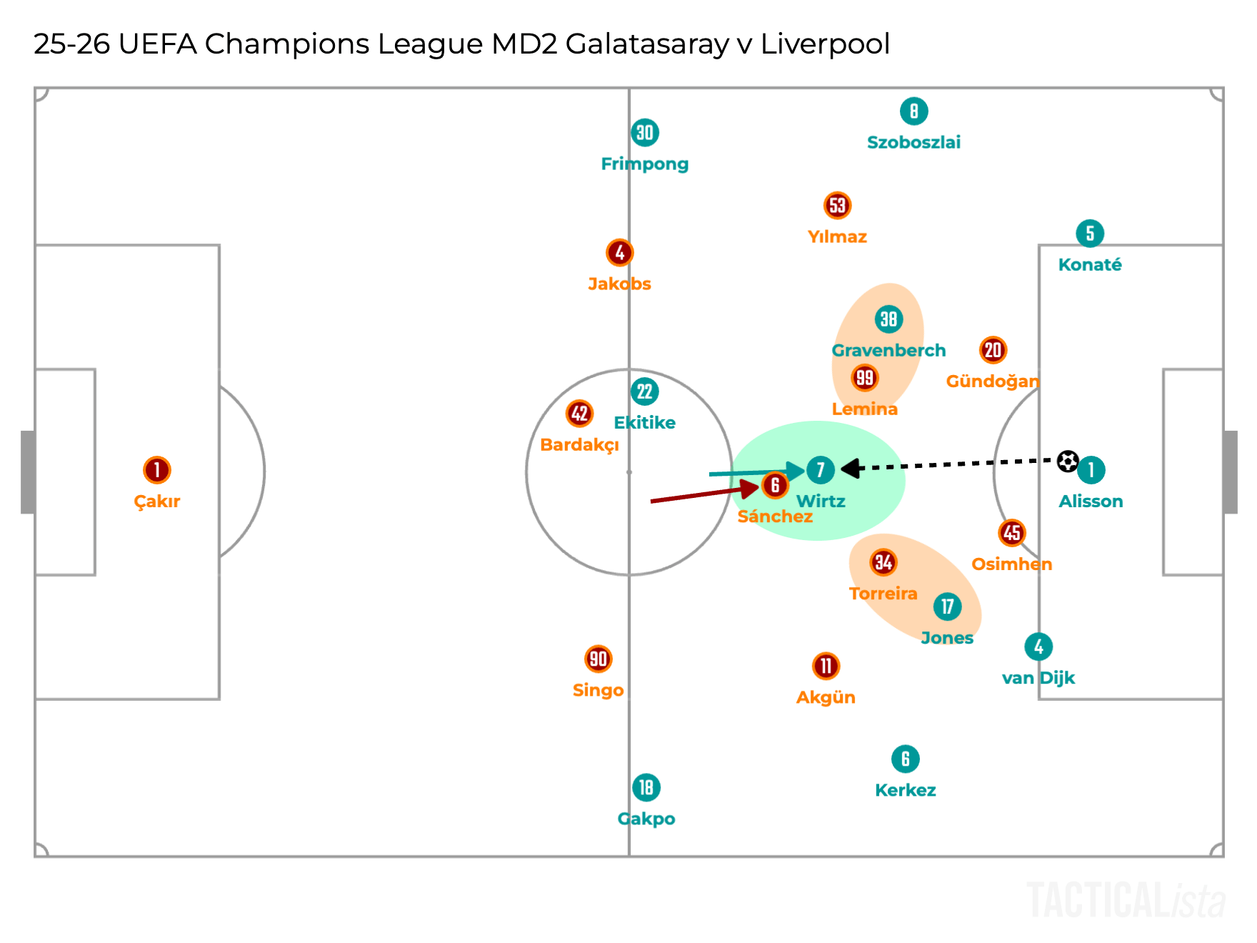 So overall, Liverpool became less dangerous when playing long, still dangerous though. The main reason behind it is the difference of the attackers up front. Mamardashvili’s distribution can be a topic, but Alisson was there against Crystal Palace and Galatasaray.