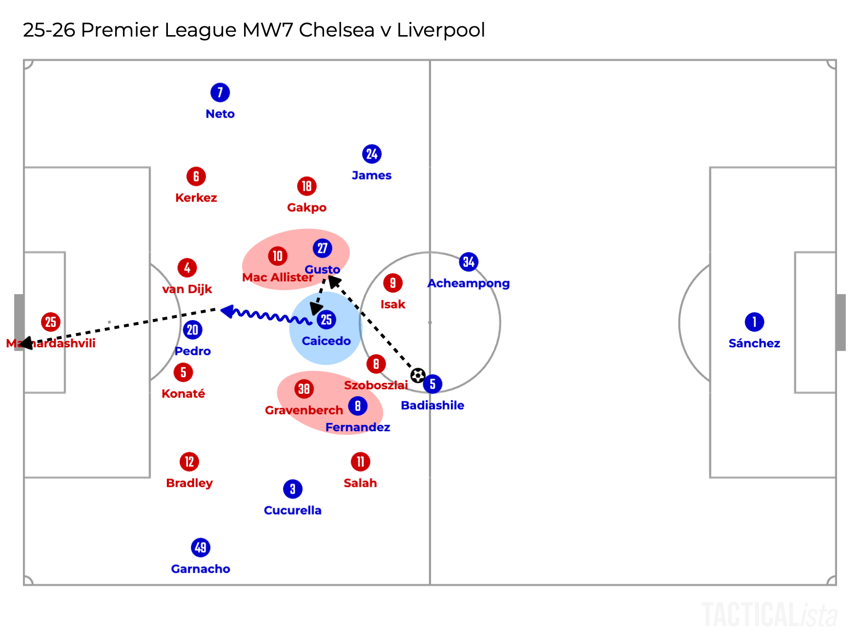 Another example would be the first goal conceded against Chelsea. This time, Soboszlai was in the front line with Isak. At the same time, both defensive midfielders were pinned by Chelsea’s attacking midfielders. So, Caicedo was completely free here.