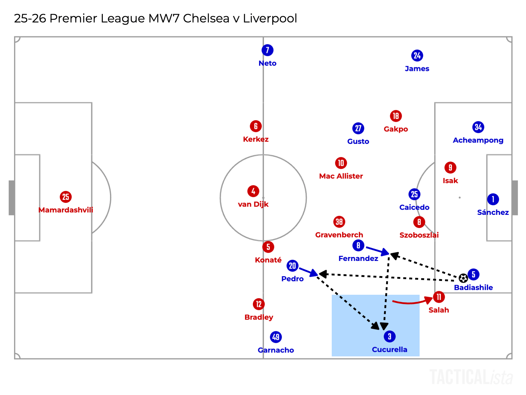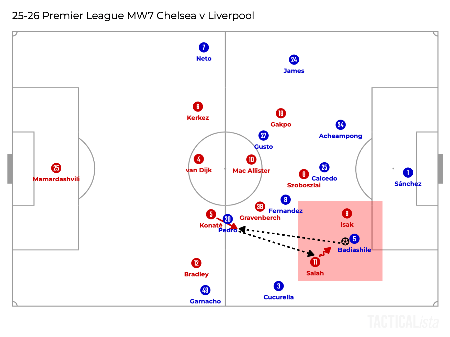 This space can be defended by two players. Bradley or Gravenberch. Initially, Gravenberch tried to jump to Cucurella while the pass was on the way to him, but especially when Enzo Fernandez dropped to receive the ball and play to Cucurella, he couldn’t jump to Cucurella as he needed to follow Enzo to drop back. And also this was just too demanding for him to cover the whole space behind Salah even with his great ability to cover huge space.