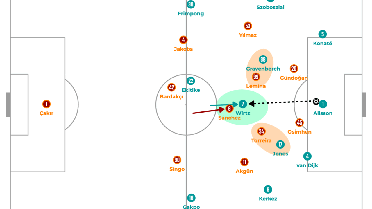As both Galatasaray’s defensive midfielders were close to Gravenberch and Jones, there was a pocket of space between them, where Wirtz tried to receive the ball. This time, however, Sánchez followed him to make it difficult for Wirtz to play comfortably.