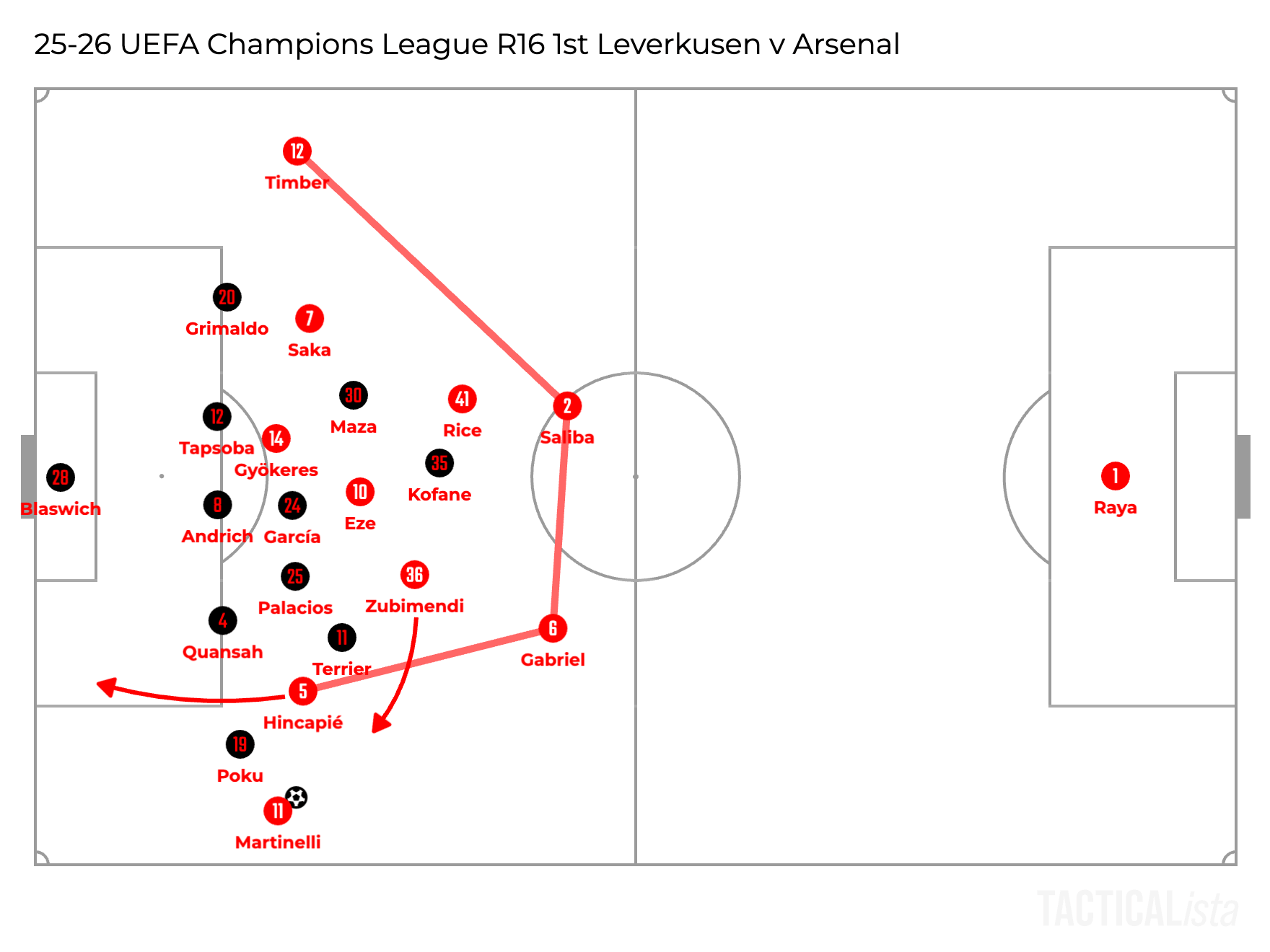 In recent games, Arteta often tilted the back line towards the right side, which the right fullback Timber played higher than the left fullback Calafiori or Hincapié. In the final third, however, the left fullback is allowed to join the attack by underlapping the winger on the ball. This deep run is difficult for the opponents to manage and a great way of taking risks in the final third.
