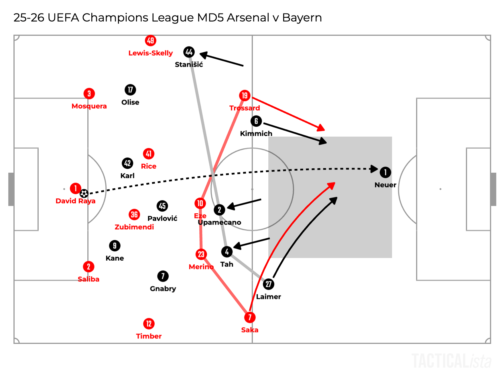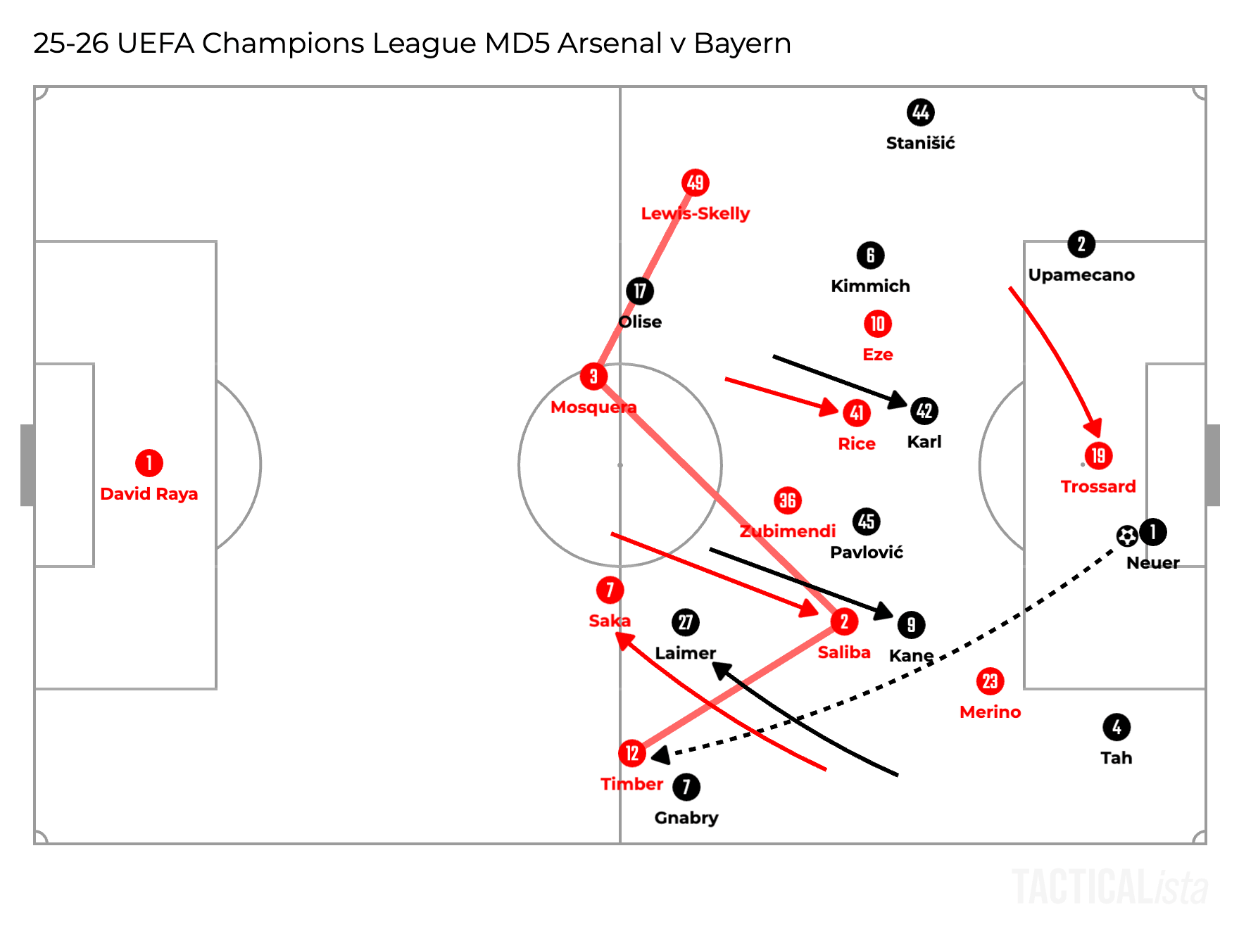 Trossard applied pressure on the opposition goalkeeper by screening the passing lane to the centre back, but on their right side, Bayern utilised a very dynamic rotation to manipulate Arsenal’s defenders. The striker Harry Kane dropped deep while the left fullback Konrad Laimer went high. Against this rotation, William Saliba followed Kane all the way and Saka kept marking Laimer even until he dropped into the back line.