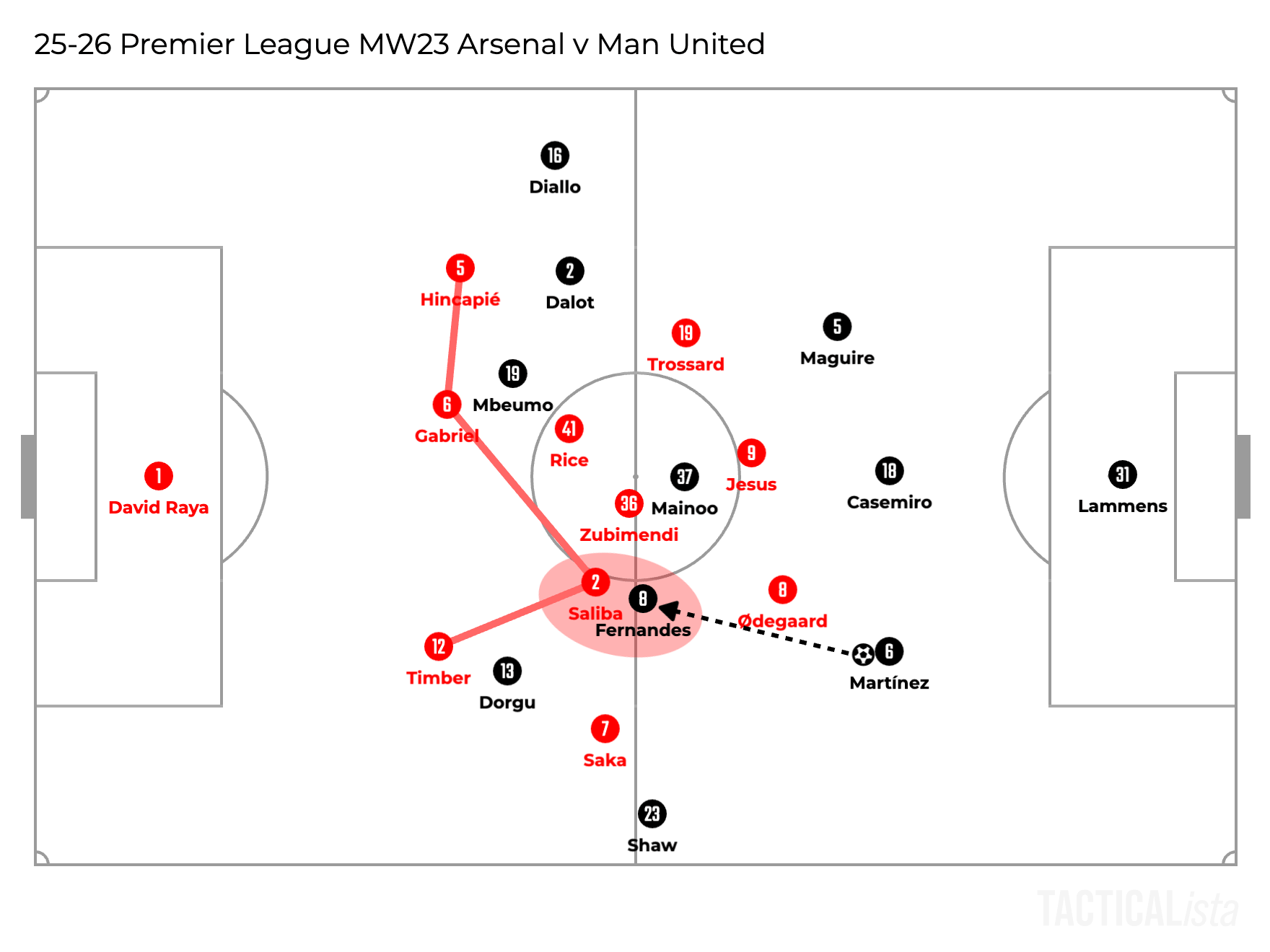The illustration below shows the scene where Lisandro Martínez played into Bruno Fernandes in between the lines and Saliba stepped out to apply pressure on him from his back.