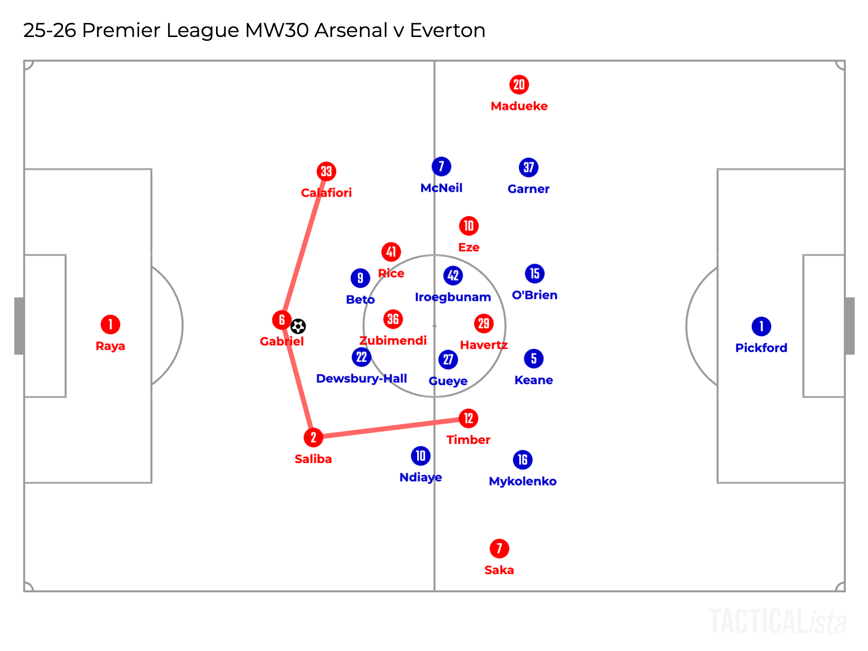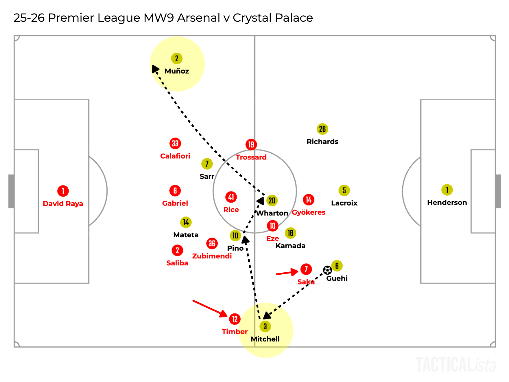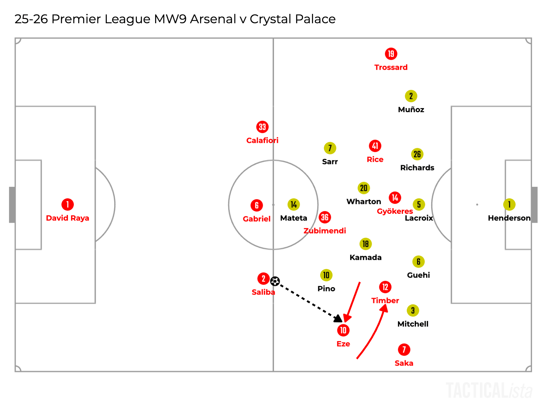 Another example is shown below, in which the right winger Saka stays outside and the right fullback Timber and the attacking midfielder Eze swaps each position.