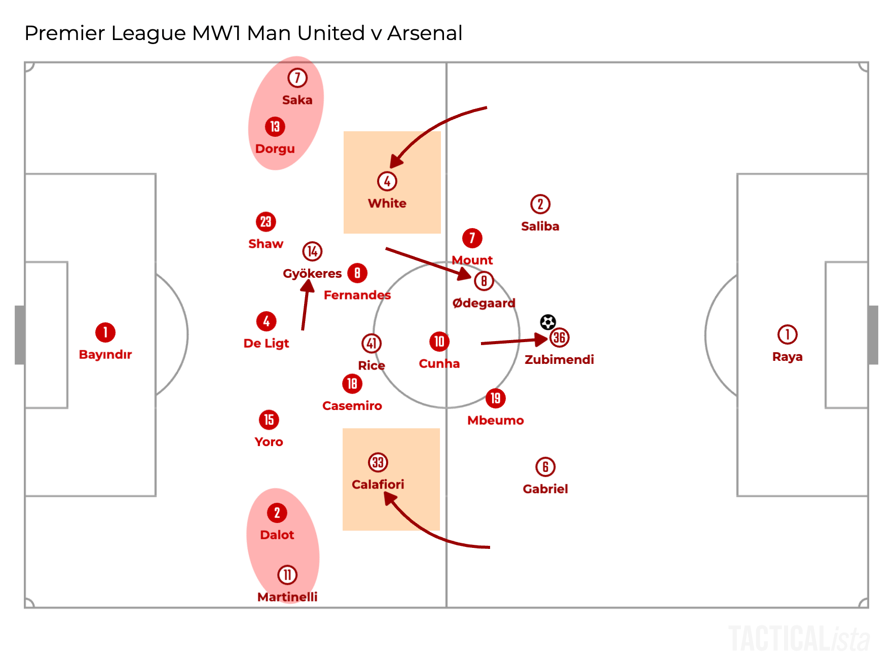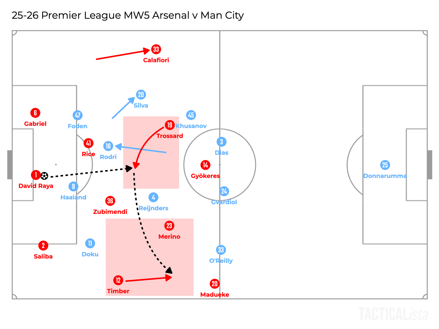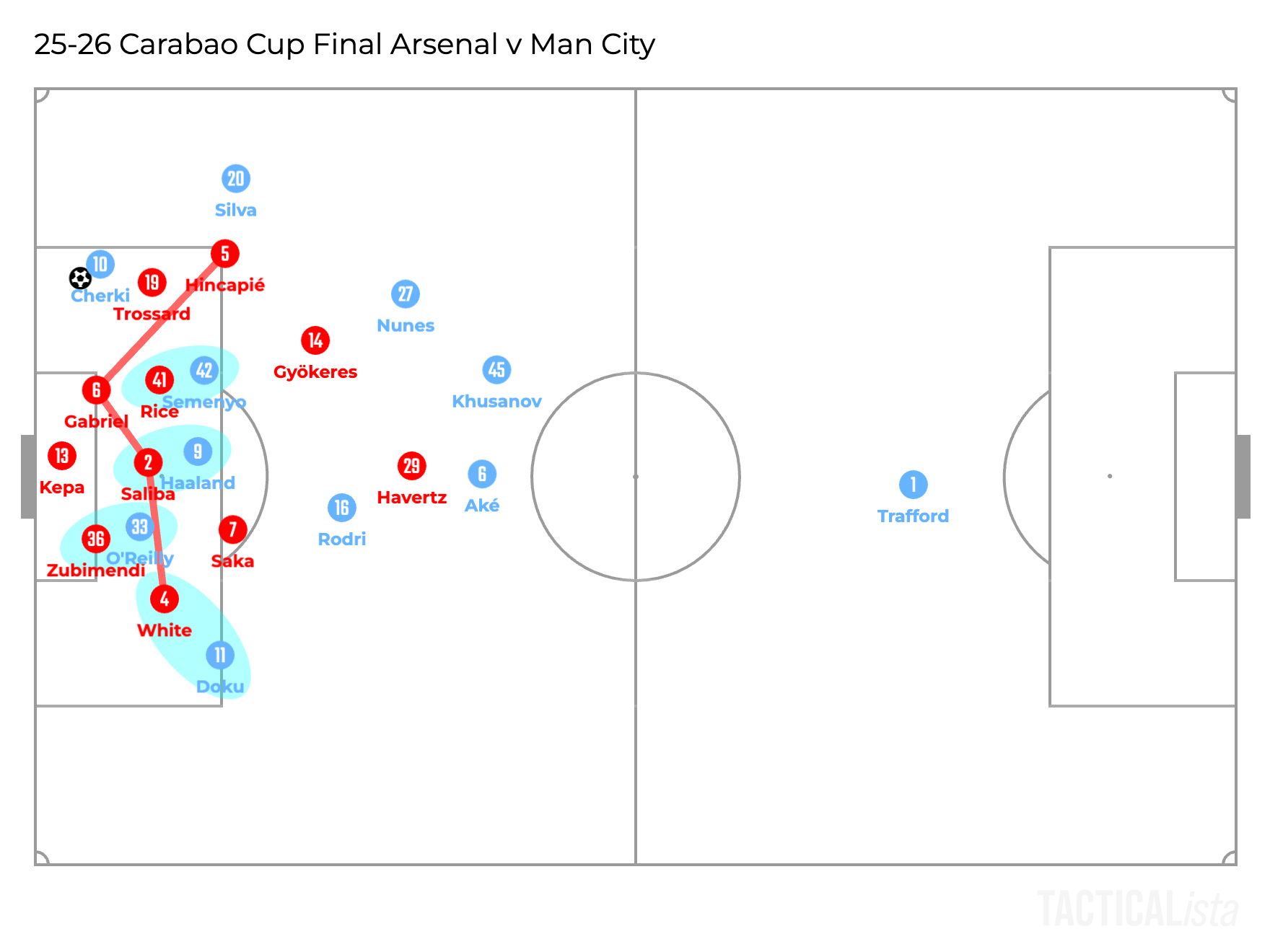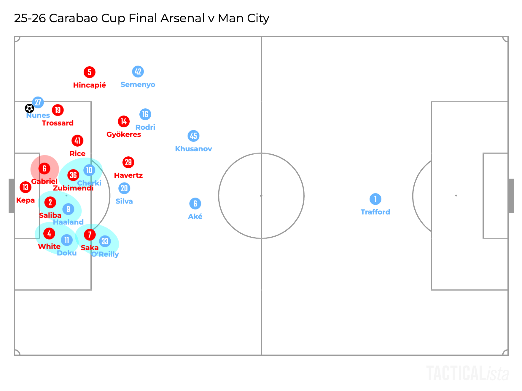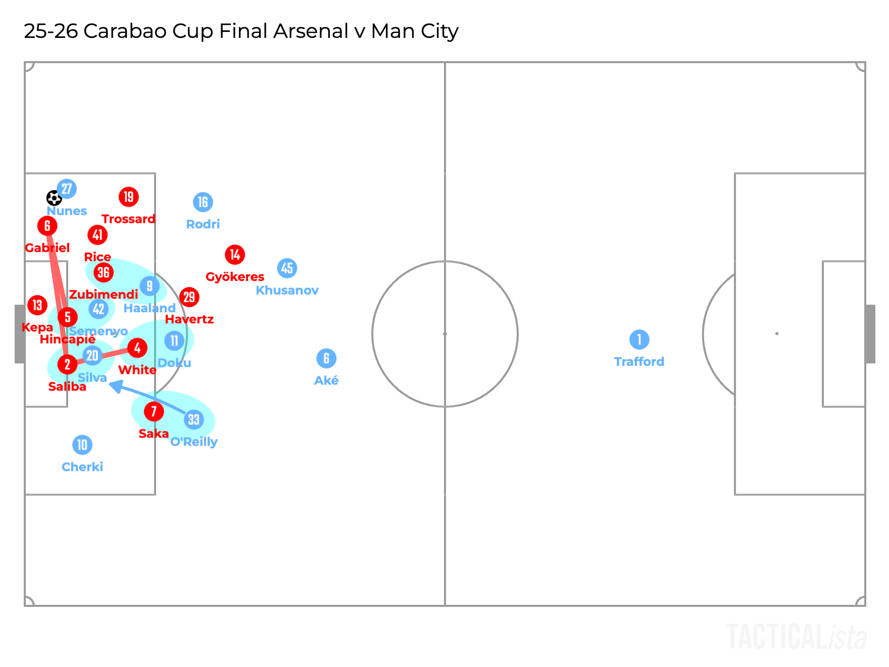 As they only focus on their markers inside the box, their positions depend on the opponents. Thus, in the illustration above, which replicates City’s first goal, Jérémy Doku stayed wide, so White didn’t tuck inside and it was Zubimendi who marked Nico O’Reilly in front of the goal, who eventually scored the goal. Additionally, Saliba was also moving away from the goal to get closer to Haaland to mark him, not to cover the space in front of the goal.