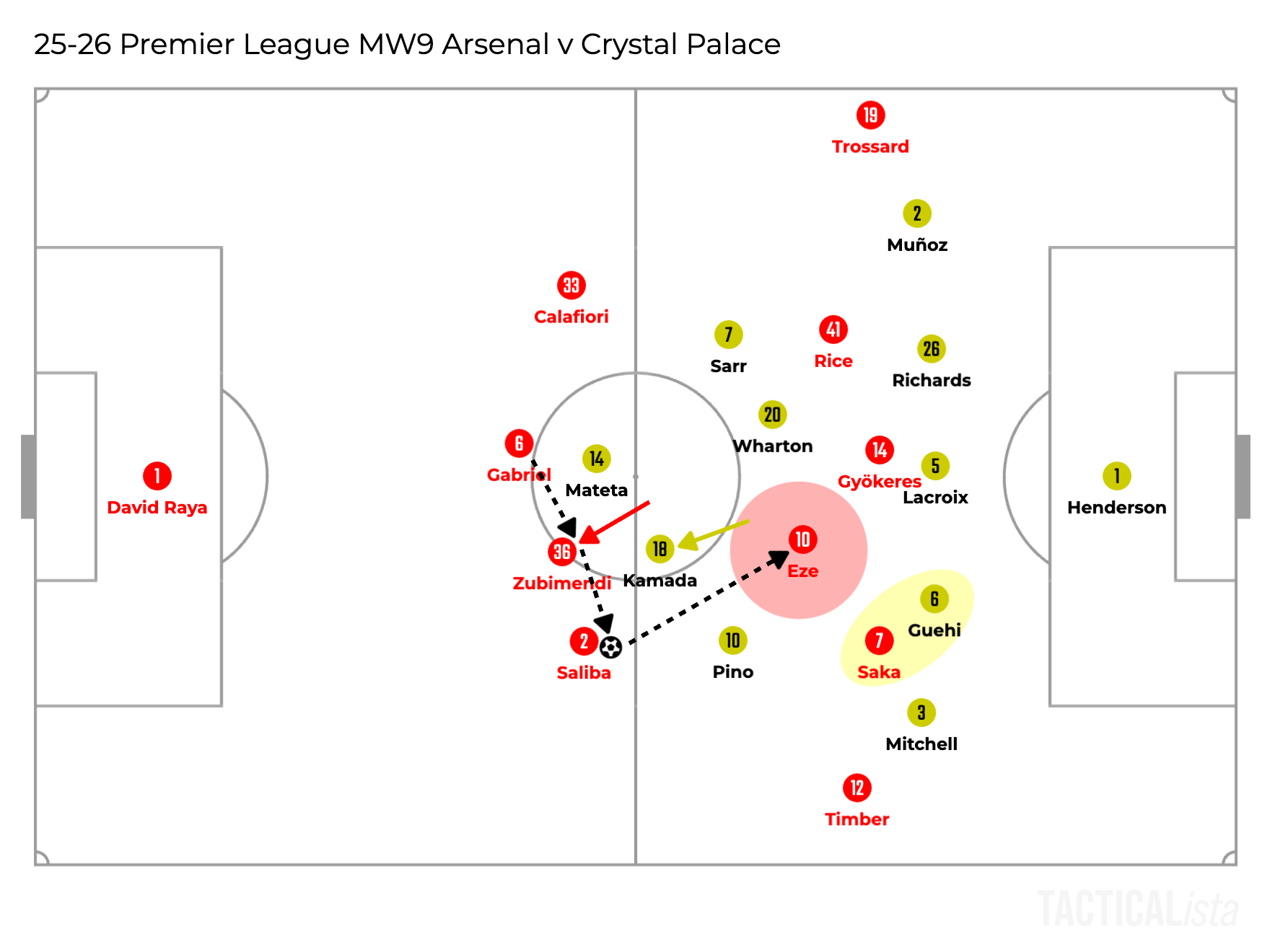 In the illustration above, Zubimendi dropped into the back line and the opposition defensive midfielder followed him, leaving space for Eze in between the lines.