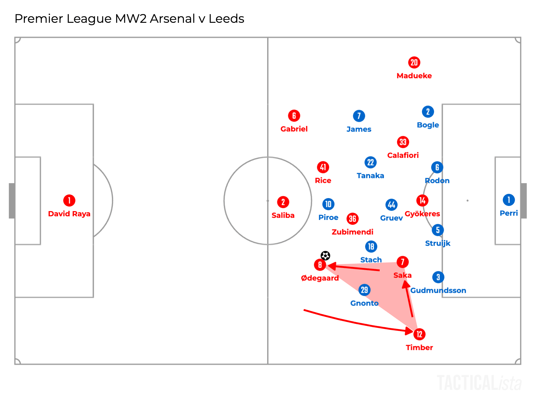 Especially on the right side, as Ødegaard prefers to drop there, the other players on the flank rotate to evenly occupy the space. The right winger Saka drifts inside while the right fullback Timber goes higher in the illustration above.